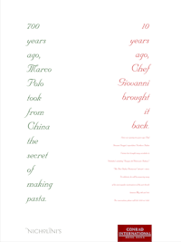 Since our opening 10 years ago, Chef Giovanni Greggio’s superlative Northern Italian Cuisine has brought many accolades to Nicholini’s including “Insegna del Ristorante Italiano”: “The Best Italian Restaurant” abroad – twice.
